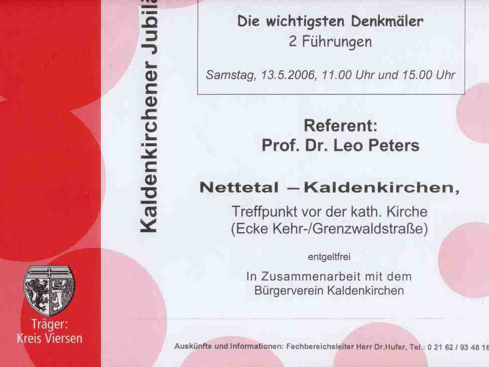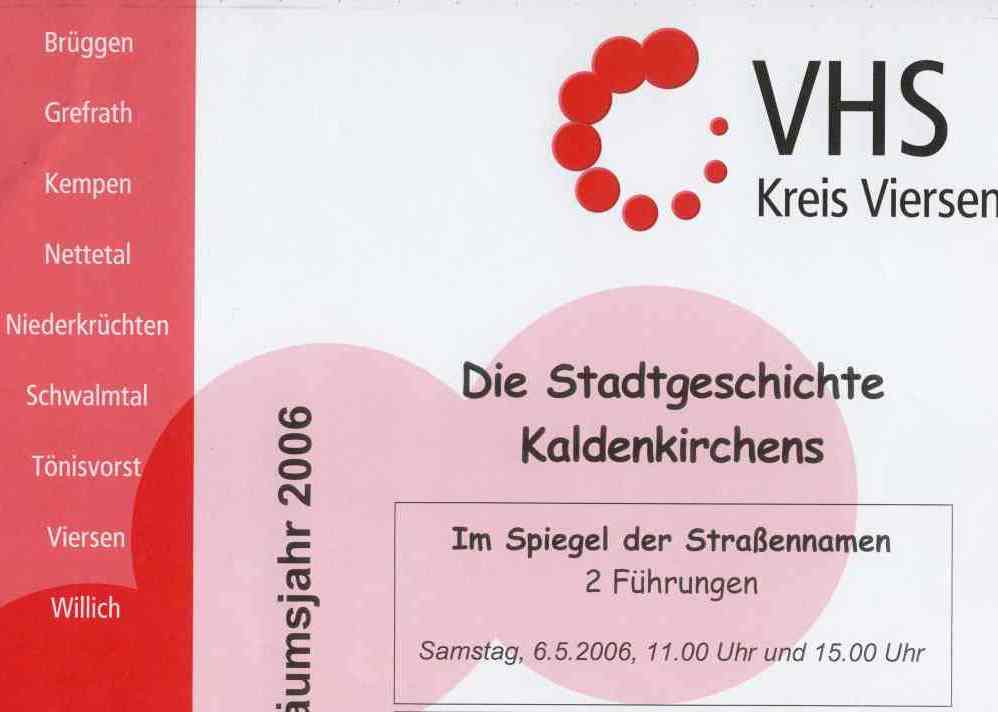 - JUBILÄUMSJAHR 2006 IN KALDENKIRCHEN - "Stadtgeschichte Kaldenkirchens im Spiegel der Straßennamen" Führungen von Prof. Dr. Leo Peters
