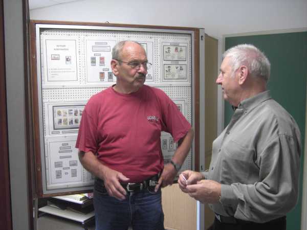 Peter Gassner zeigt Briefmarken zum Thema Polizei